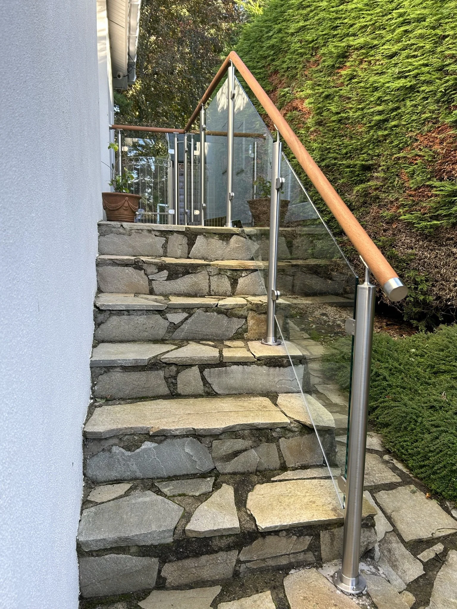 Side steps Glass Balustrade - Killiney Marine Grade Stainless Steel & Glass Balustrade with Teak Handrail.