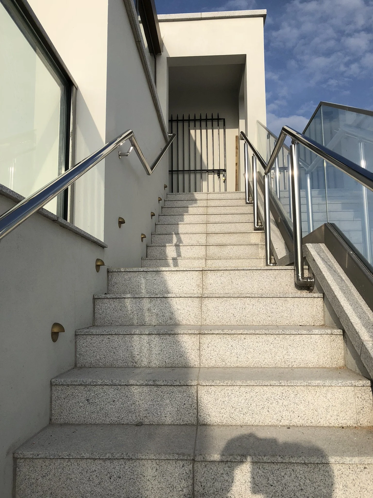 Mirror Handrails - Clontarf Baths Marine Grade, Mirror finish, Tubular, Side-Mounted Stainless Steel Handrails to Steps.