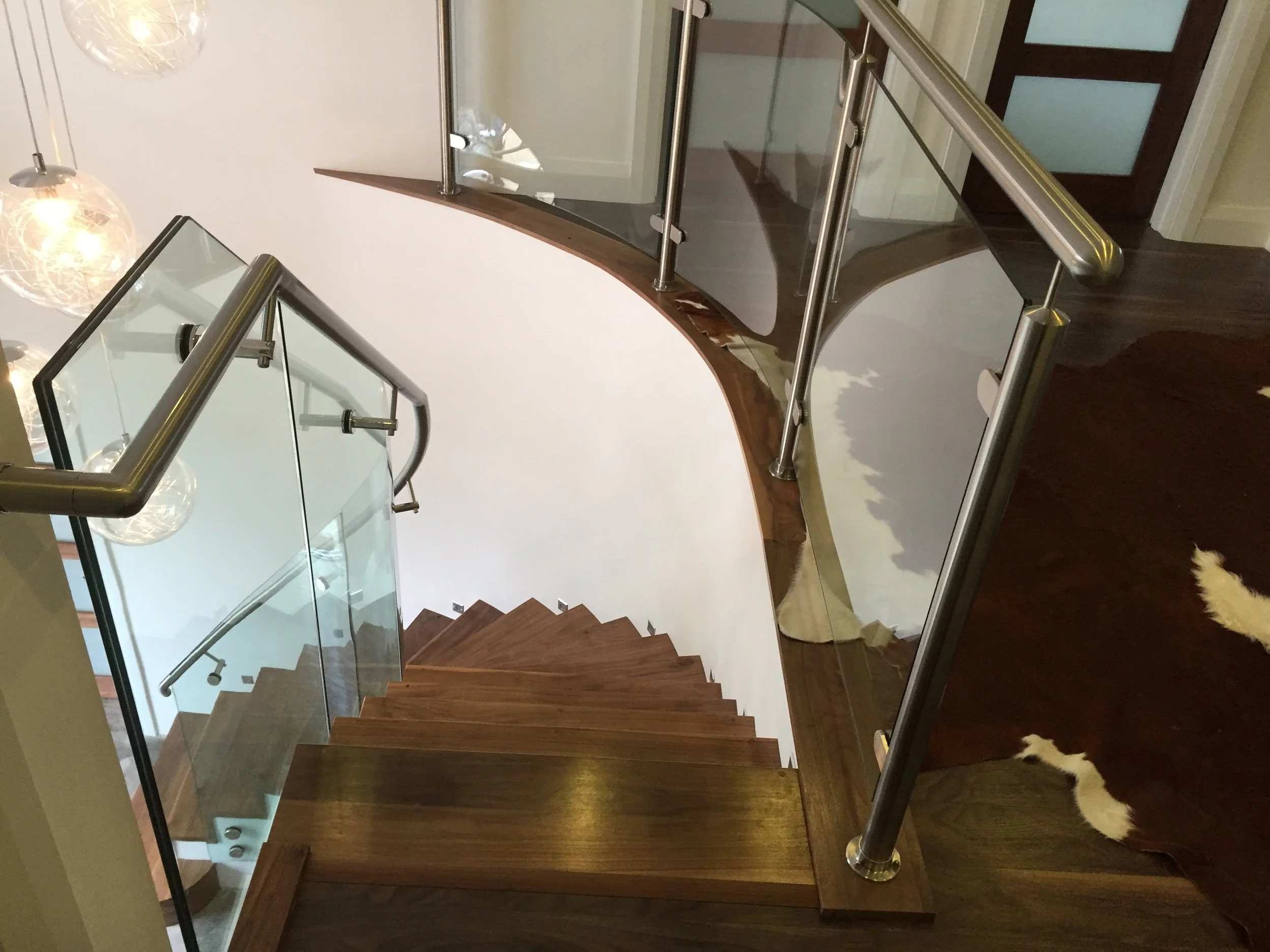 ‘McCreadies’ Balustrades. Curved Stainless Steel and Glass Balustrades with Opal glass facias, Hardwood treads with inset Stainless Steel grip, slotted Stainless Steel handrail on landing glass balustrade.