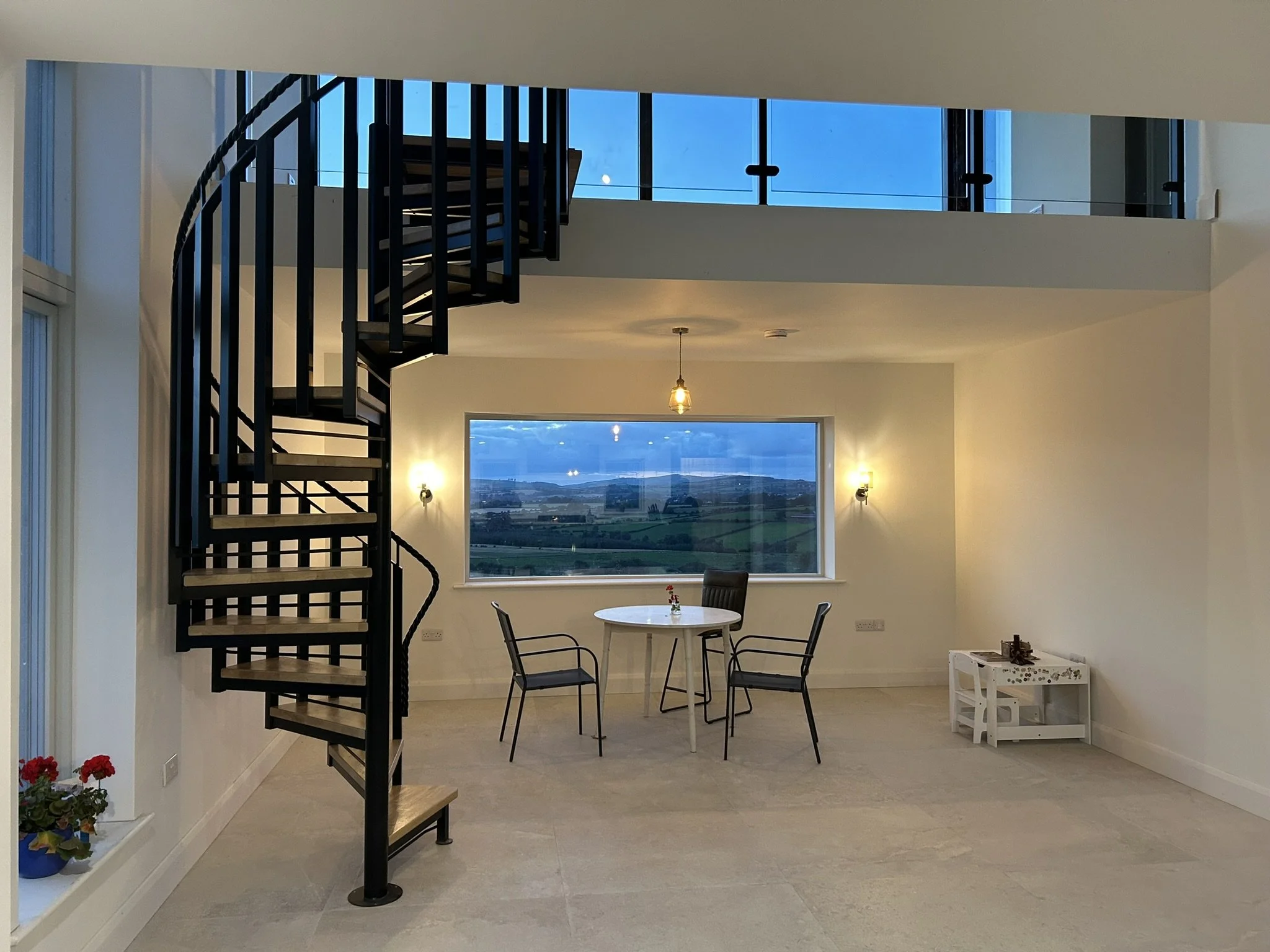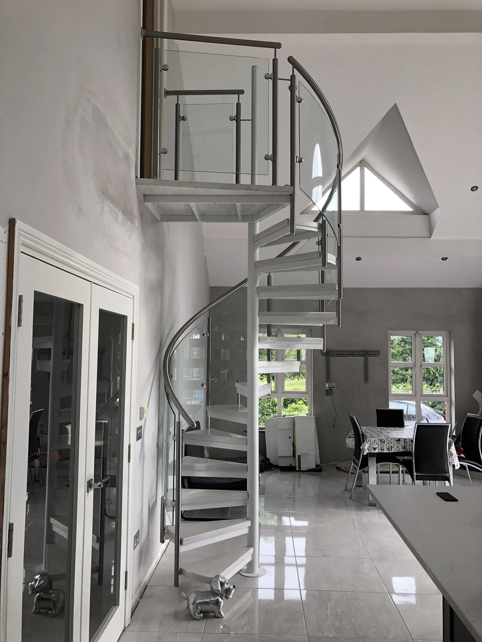‘Ballaly’ Orbital Spiral Stairs. Orbital ‘ style Spiral Stairs with Curved Glass Balustrade and Stainless Steel Handrail.
