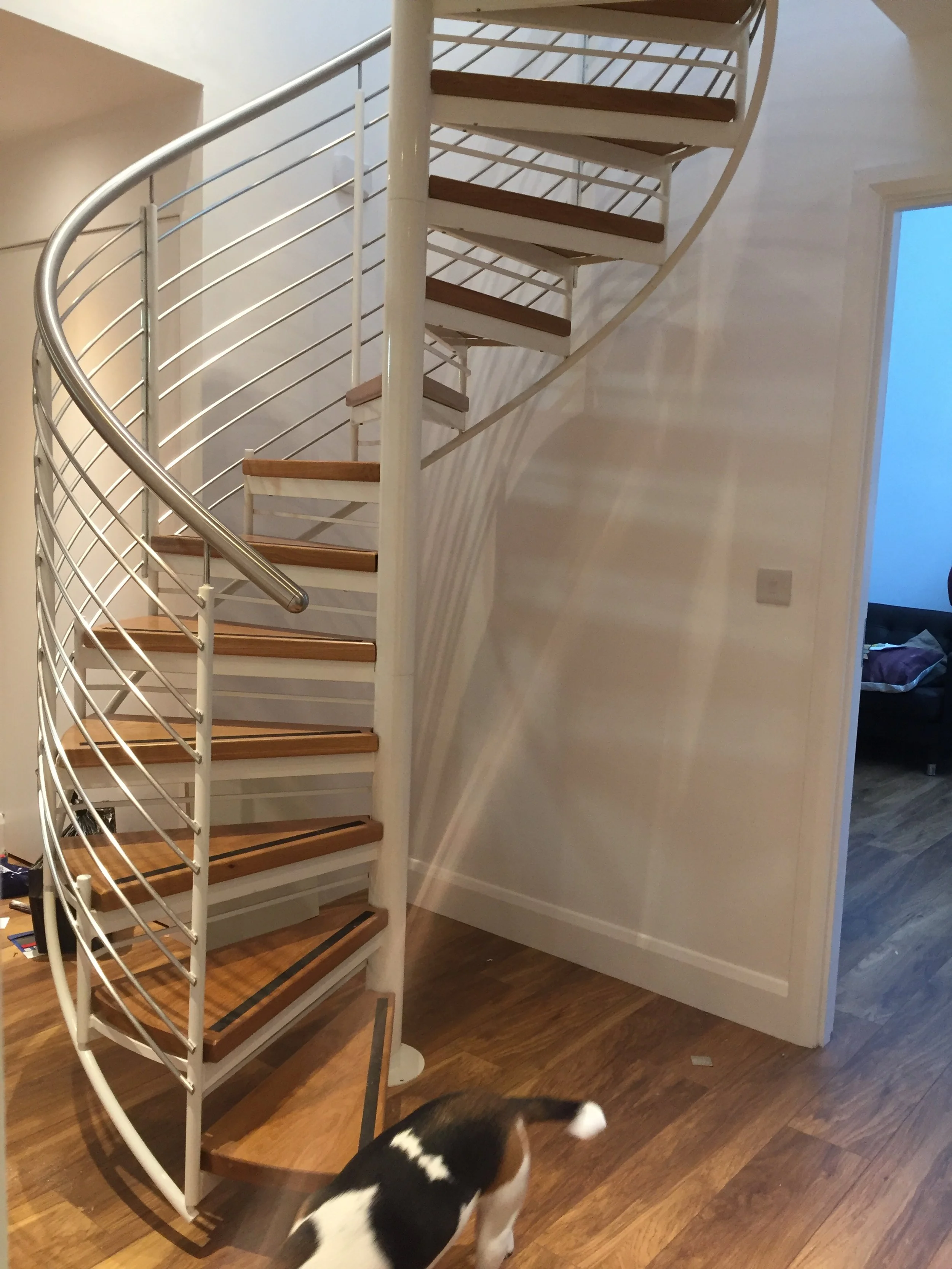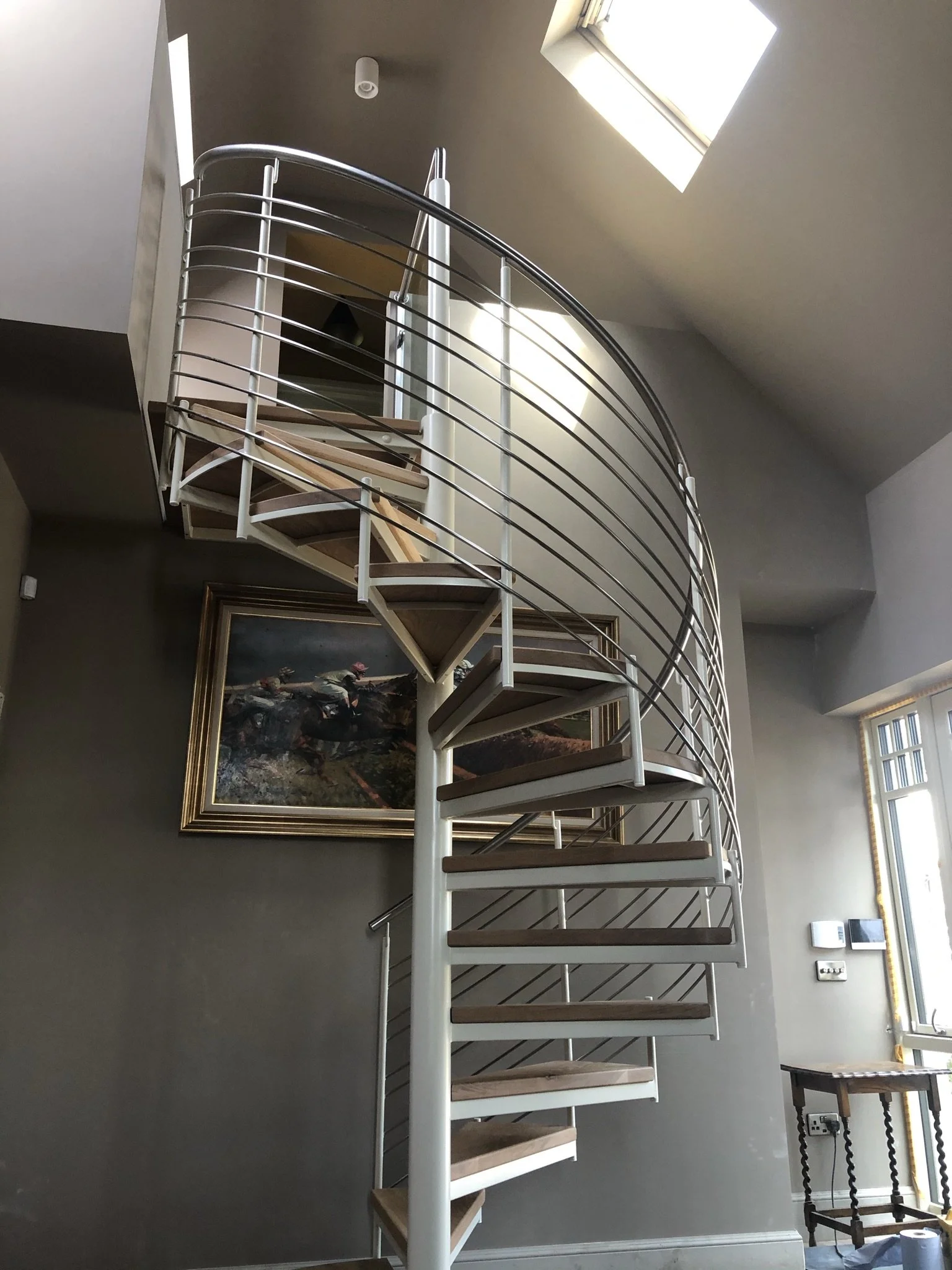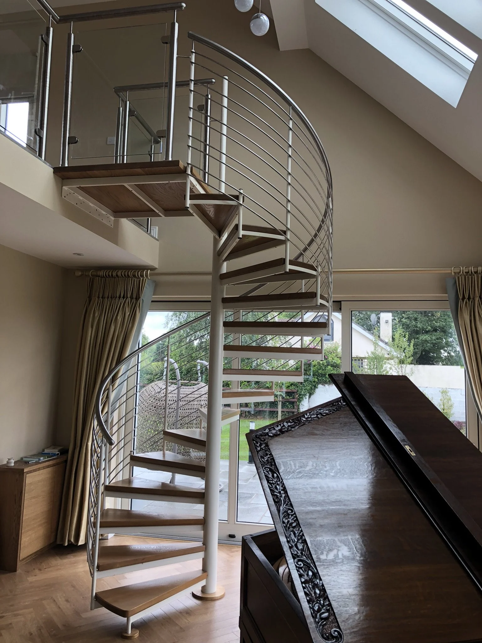 Slipstream - Bray 'Slipstream' model Spiral Stairs, with Stainless Steel Handrail and rod Balustrade and solid Oak Treads and Landing.