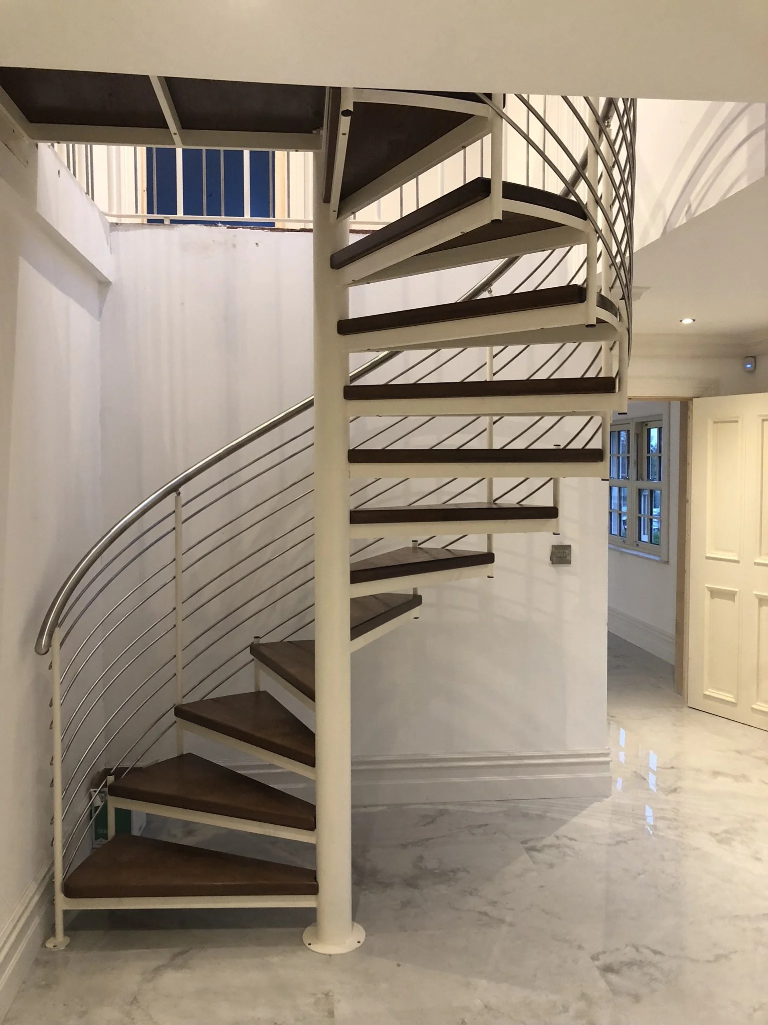 Slipstream 'Slipstream' model Spiral Stairs with Stainless Steel Handrail, raking rod Balustrade and Walnut Treads