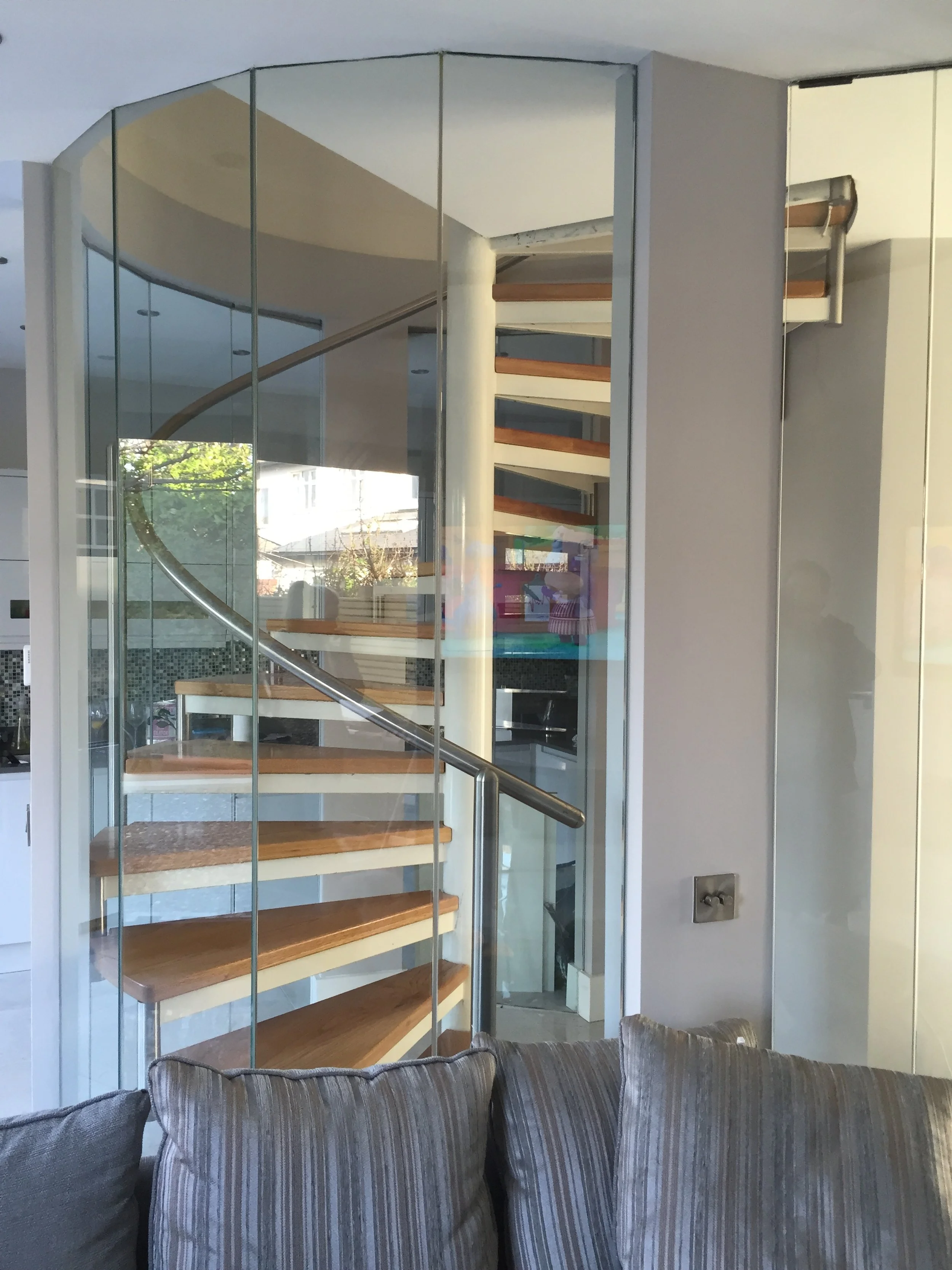 Glass Wall Orbital Glass wall enclosed, 'Orbital' model Spiral Stairs with Stainless Steel Handrail and curved Glass Balustrade